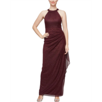 Alex Evenings Metallic Knit Long Halter Neck Dress with Ruched Wai...