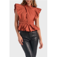 ELAN wrap top with flutter pleated sleeve in rust