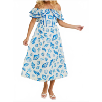 LE LIS shelly off shoulder midi dress in white/ blue