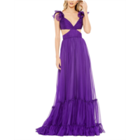 Mac Duggal Chiffon Deep V-Neck Sleeveless Ruffled Shoulder Ball G...