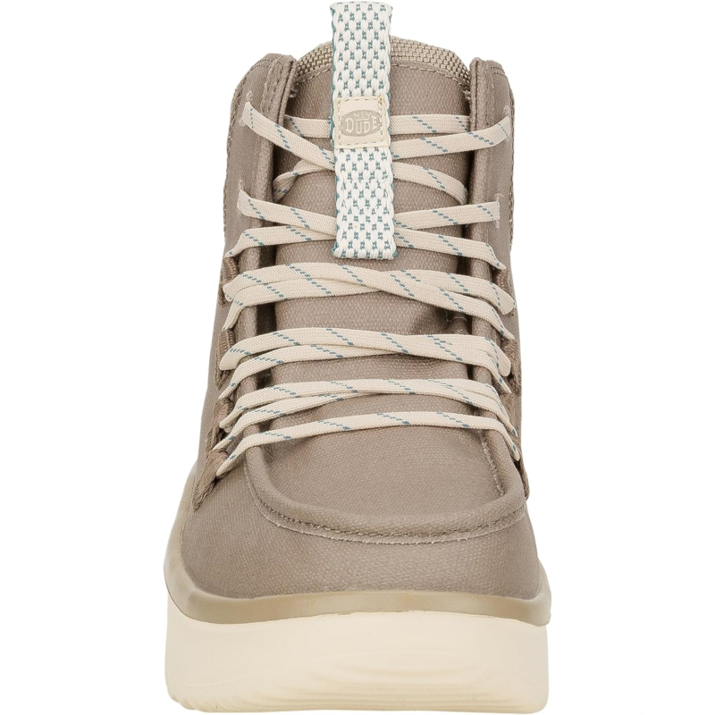 - Walk into the Hey Dude Wendy Peak Apres Coated Twill, where water-resistant, premium leather uppers keep your feet warm and stylish, no matter the weather. Enjoy the fabric lining and cushioned EVA insole for ultimate comfort, while the lightweight, flexible rubber outsole ensures effortless movement. With a round toe and easy slip-on design, these ankle-high booties offer practical elegance and seasonal flair with lace design, making them your go-to choice for any adventure.
