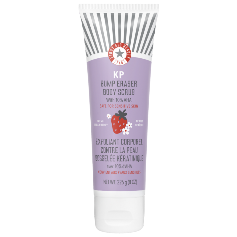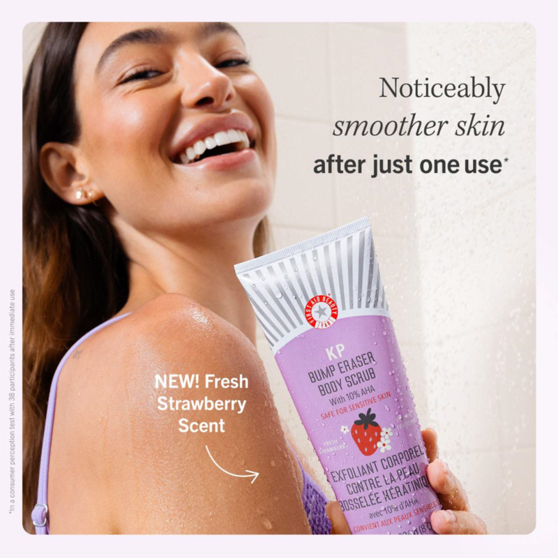 What Else You Need to Know: Visibly slough away KP bumps and strawberry skin with this body scrub, now in a natural strawberry?scent to refresh your shower routine. The fast-acting formula combines chemical and physical exfoliants to visibly improve skin’s?texture and smooth bumps after just one use.