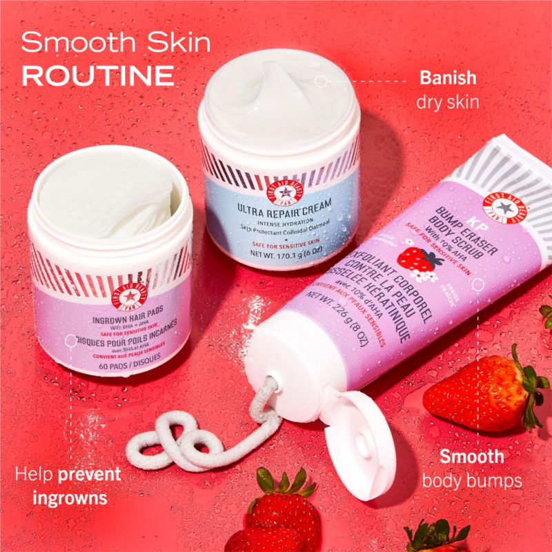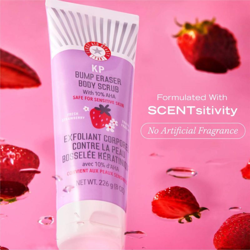 What Else You Need to Know: Visibly slough away KP bumps and strawberry skin with this body scrub, now in a natural strawberry?scent to refresh your shower routine. The fast-acting formula combines chemical and physical exfoliants to visibly improve skin’s?texture and smooth bumps after just one use.