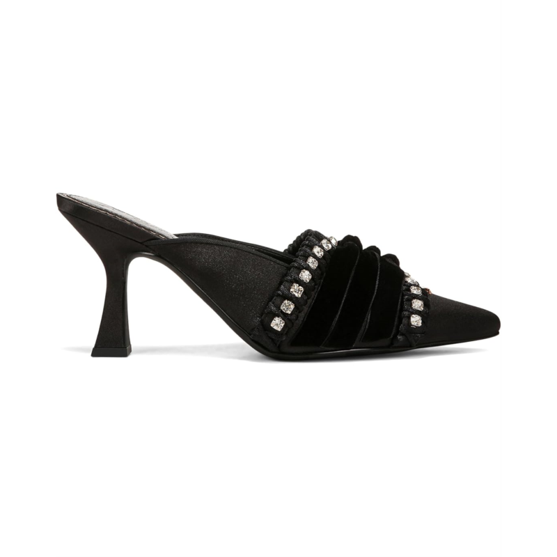 With a crystal trim and ribbon ties, Tristyn embodies the best part of the cold weather seasons-rich textures and awesome indulgences. Featuring a fabric upper, synthetic lining and insole, pointed toe silhouette in a slip-on style and flared heel.
