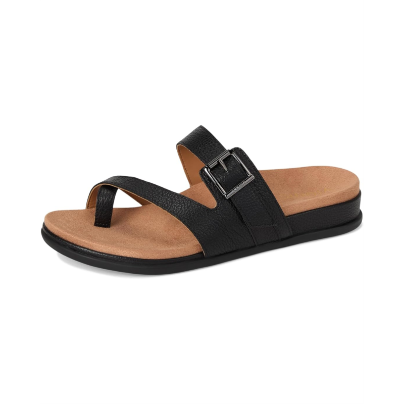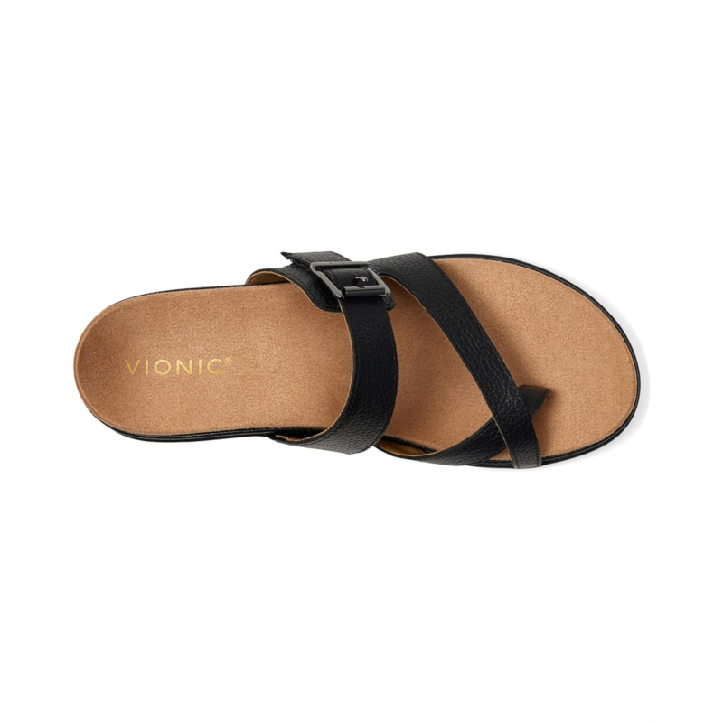 - Delight in VIONIC Carmela Thongs and slip into these toe-post loop sandal with just enough coverage and an adjustable hook-loop strap-wrapped footbed designed for optimal comfort. Designed with exclusive alignment technology to balance the whole you. Crafted from premium leather upper materials. Durable rubber outsole designed to withstand everyday wear. Comfortable toe post loop that ensures comfort without irritation. Lightweight, flexible EVA midsole absorbs shock, reducing stress on feet, ankles, and knees. Vionic Technology is biomechanically designed to hug your arches and support your feet in comfort. Vionic sandals'' built-in orthotic is shown to be effective in helping to treat heel pain caused by plantar fasciitis or achilles tendonitis. Built-in VIO MOTION Technology footbed featuring contoured arch support, with shock-absorbing cushioning, deep heel cup to provide stability, and forefoot flexibility. For optimal comfort, wear your new Vionic shoes for a few hours to let your feet adapt. Within 1-2 weeks, you should experience full orthotic comfort and support.