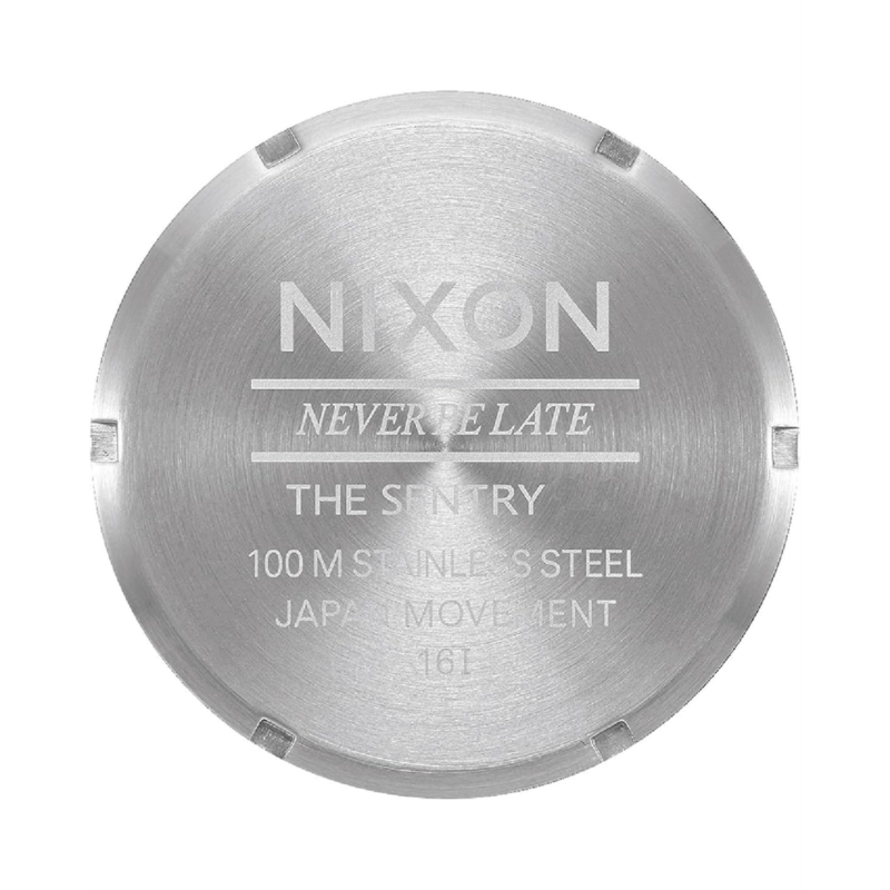 - Keep this timepiece Nixon Sentry Stainless Steel watch for perfect balance of style and function. It has Miyota Japanese quartz 3 hand display with day and date, applied indices, printed seconds track, and custom molded hands. The watch is made of 10ATM custom solid stainless steel case, hardened mineral glass dial, triple gasket crown with enamel fill, stainless steel screw down caseback, and spring pin lugs.