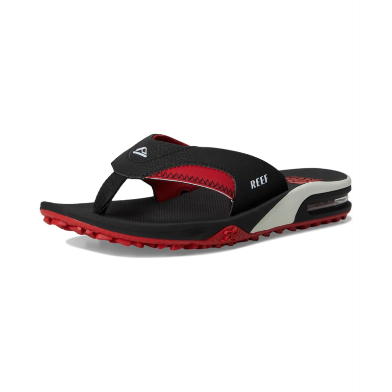 - Easygoing and versatile, these Reef Fanning Pregame slide sandals are made for laid-back days and effortless style. With tried-and-true Fanning comfort features and all-terrain traction, this is the sandal to help you win it all from the tailgate to the stadium and beyond. Crafted from EVA upper, and soft padded jersey liner for no break-in period. Featuring round toe, compression molded high rebound EVA with a built-in airbag under foot for added comfort, and anatomical arch support.
