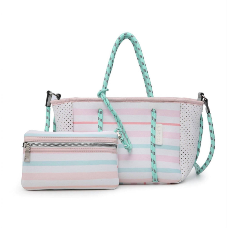 Jen & Co. coralia mini neoprene bag in multi stripe