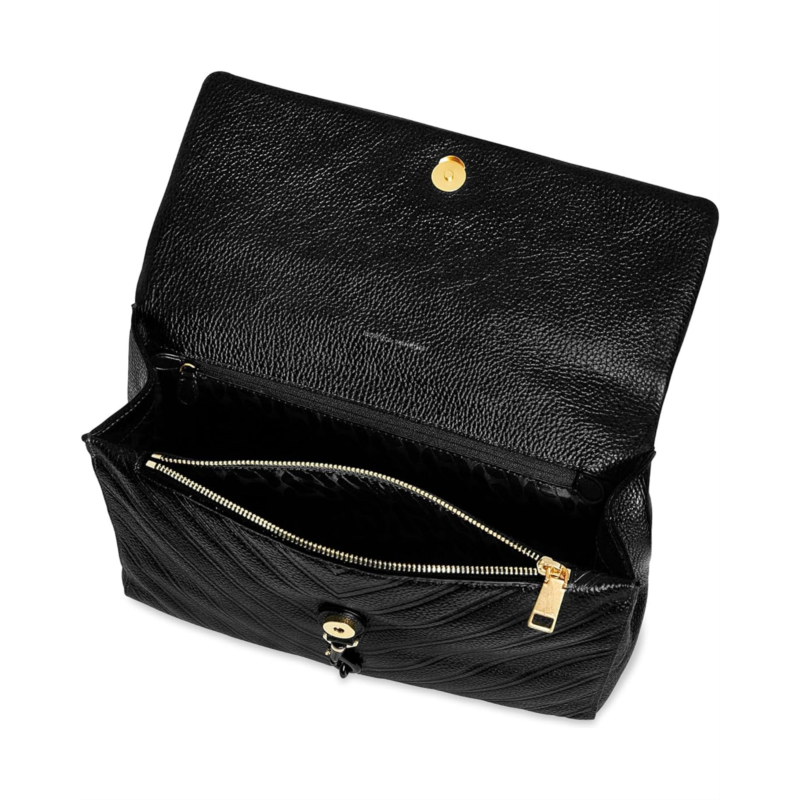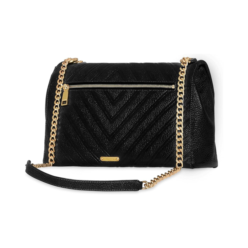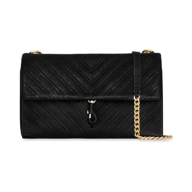 - Quilted chic, effortless elegance. The Rebecca Minkoff Edie Emboss Large Shoulder bag is your go-to for understated sophistication. Crafted from genuine leather with subtle chevron stitching, this beauty exudes timeless charm. The sleek gold chain strap and multi-hardware accents add a polished shine, while the fold-over flap with magnetic snap closure keeps things effortlessly stylish. Designed for versatility, it features a front top zippered pocket and a back zippered pocket, offering convenience without compromising on style.