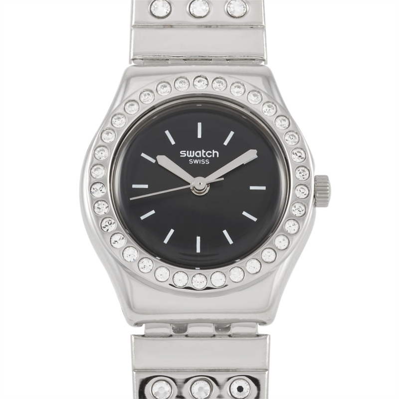 This Swatch Tan Li 25 mm Stainless Steel Watch, reference number YSS318B, is a classic piece. The watch is made with a stainless steel case that measures 25 mm in diameter. The case is presented on a matching stainless steel bracelet featuring deployment closure. The black dial displays hours, minutes, and seconds. This model is equipped with quartz movement and is water-resistant to 30 meters.This timepiece is offered in unworn condition and includes the manufacturer’s box and papers.