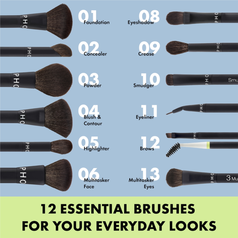 The Essential Brush Collection has been developed with a more responsible approach. The bristles are vegan and made with synthetic hair designed to mimic the softness and precision of natural hair. The handle contains 40-percent rice husk waste, as a by-product of the rice production process, and 60-percent recycled plastic. The plastic pouch can be used to store all your makeup and brushes.