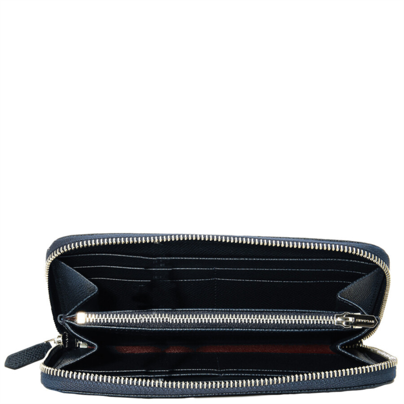 Bvlgari Men''s Wallets. SKU: 282588. Color: Blue. Size: 7.5 x 3.9 x 1 inche. Bvlgari Blue Leather Zip Wallet. Crafted from grain calf leather, the wallet showcases the iconic Bvlgari double logo, featuring a zip-around closure, eight credit card slots, two bill compartments lined in Roman garnet burgundy moire silk, and two additional internal pockets. 100% Leather. Made in Italy.