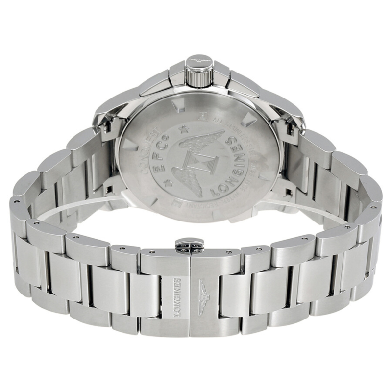 Stainless steel case with a stainless steel bracelet. Fixed stainless steel bezel. Black dial with luminous silver-tone hands and index hour markers. An Arabic numeral appears at the 12 o''clock position. Minute markers around the outer rim. Dial Type: Analog. Luminescent hands and markers. Date display at the 4 o''clock position. Chronograph - three sub-dials displaying: 60 second, 30 minute and 1/10 second counter. Longines calibre L442 quartz movement. Scratch resistant sapphire crystal. Screw down crown. Solid case back. Round case shape. Case size: 41 mm. Case thickness: 15.15 mm. Band width: 21 mm. Butterfly clasp. Water resistant at 300 meters / 1000 feet. Functions: chronograph, date, hour, minute, second. Conquest Series. Dive watch style. Watch label: Swiss Made. Longines Conquest Chronograph Quartz Black Dial Men''s Watch L3.702.4.56.6.