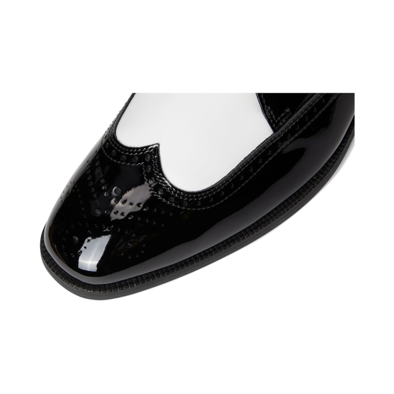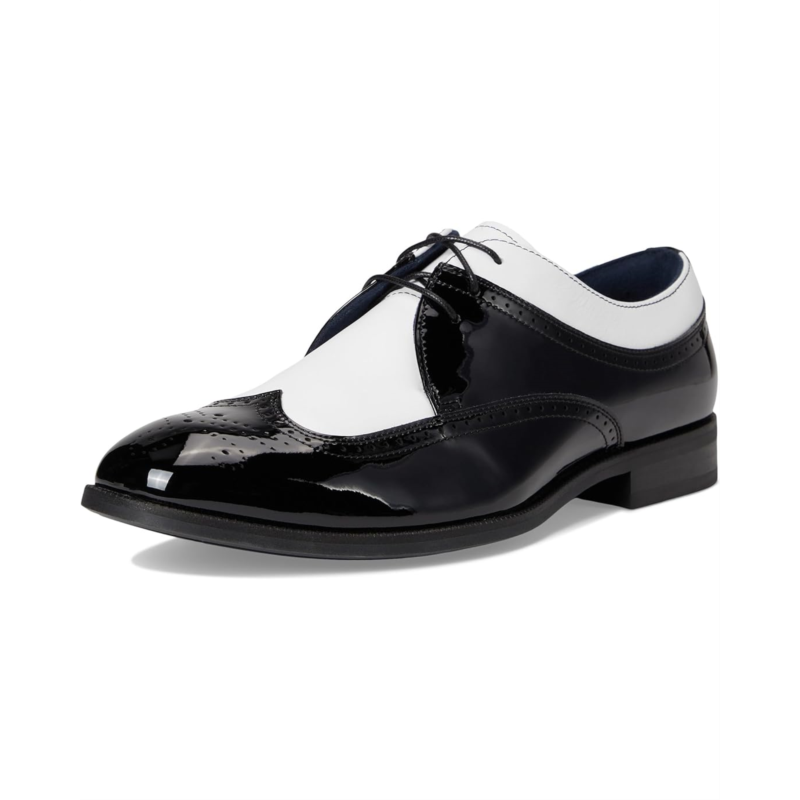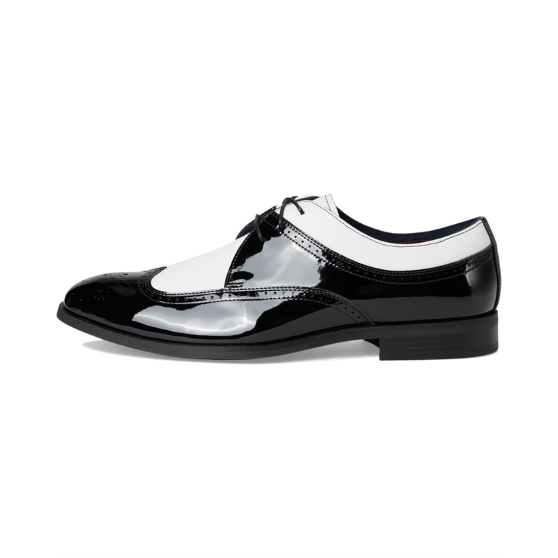 - The Stacy Adams Dayton II Wing Tip Lace-Up shoes bring you a classic spectator shoe style in stark black and white contrast patent leather. They are made of a microfiber lining for added comfort and a removable FlexZone footbed with a molded heel cup and sustainable microfiber cover that provides anatomical arch support that adapts to your stride for a more comfortable fit. These lace-up dress shoes will leave no head unturned, wear it to a wedding or anytime you want to make an occasion special.
