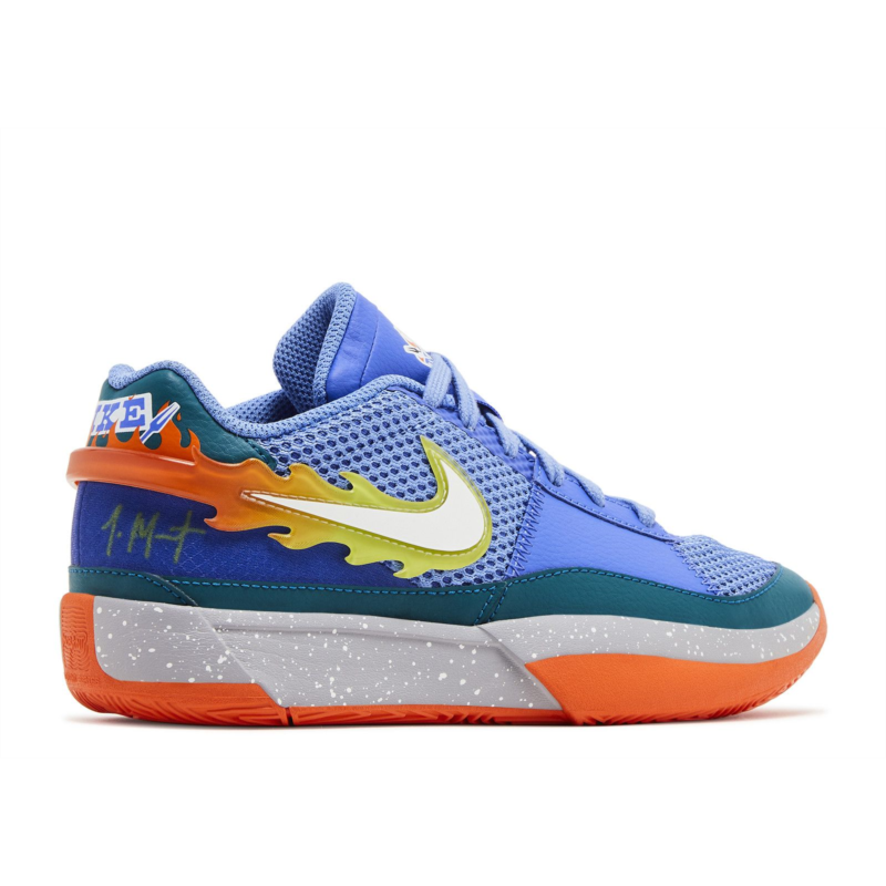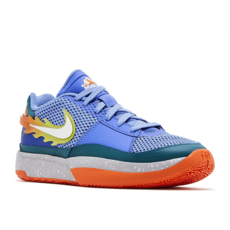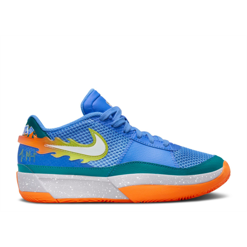 The Nike Ja 1 GS ‘Backyard BBQ’ draws inspiration from the back garden where Ja Morant played host to weekly barbecues for his friends and family. Made from a breathable pastel blue mesh, the upper gets a wraparound Swoosh outlined in orange and yellow flames. The tongue includes a tagline that reads ‘On Fire Since ‘99’ which signals Morant’s birth year. The speckled grey Phylon midsole rides on a durable rubber outsole for smooth traction.