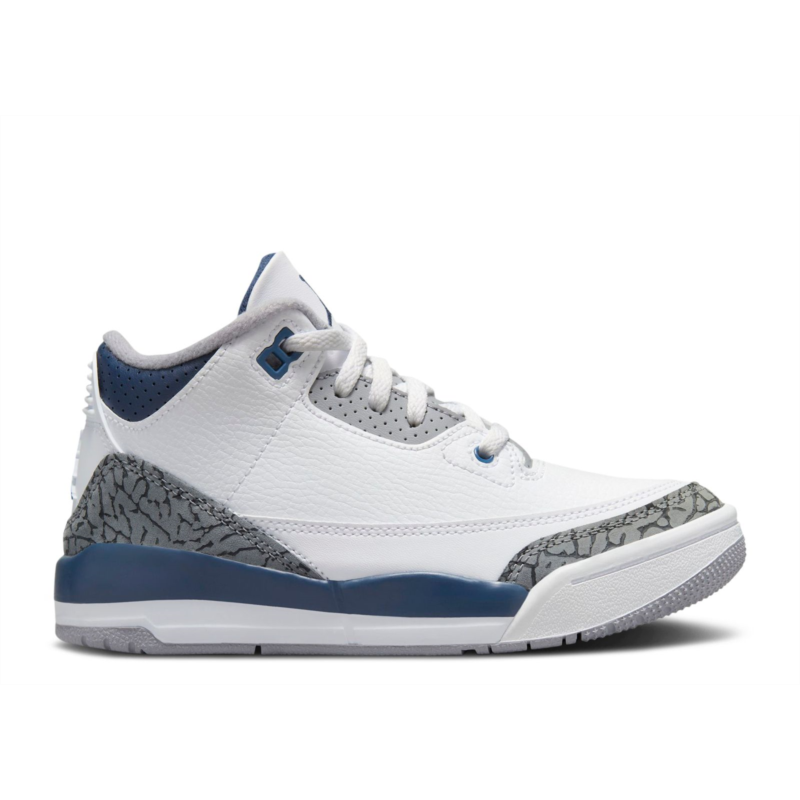 The Air Jordan 3 Retro PS ‘Midnight Navy’ is crafted for young children and delivers Tinker Hatfield''s iconic creation in white tumbled leather upper with grey elephant-print overlays on the forefoot and heel. The raised Jumpman emblem adorning the molded back tab harmonizes with the stitched Jumpman logo in navy tones. The shoe features a lightweight white foam midsole accented with Midnight Navy highlights along the heel, and sits on a grey rubber outsole.