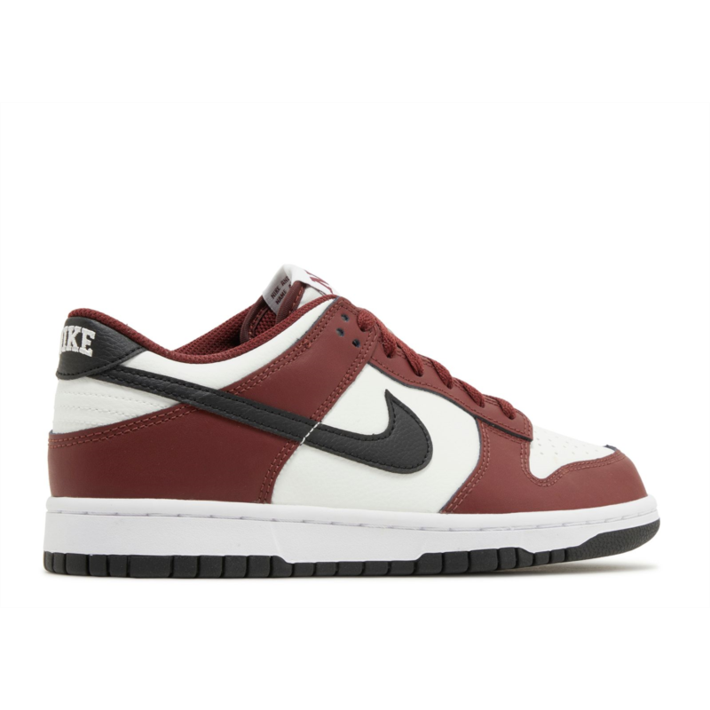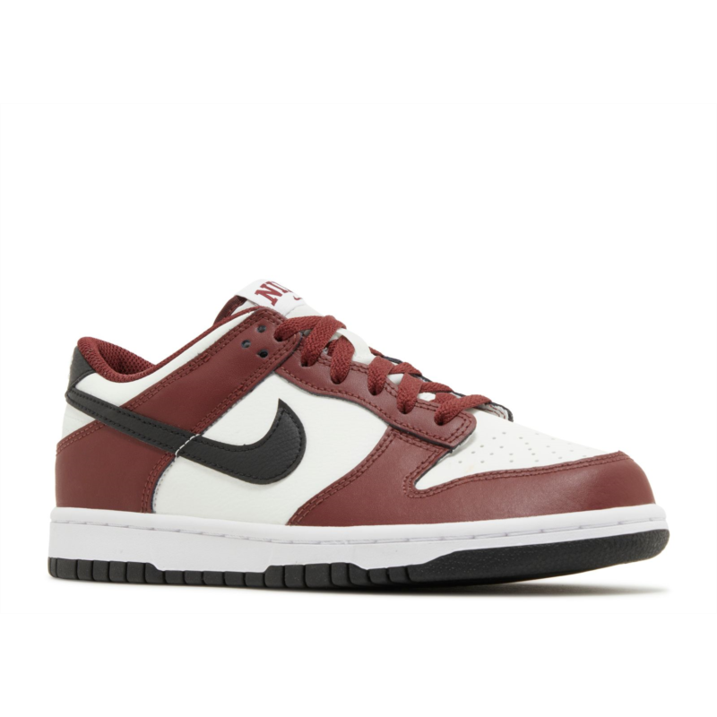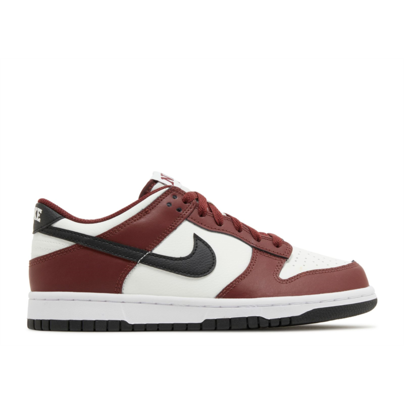 The Nike Dunk Low GS ‘Dark Team Red’ brings a clean white upper with contrasting burgundy forefoot and heel overlays. The Swoosh and back tab, which includes an embroidered Nike wordmark, are present in black to give these shoes a subtle contrast. The rubber cupsole couples white sidewalls with a black outsole to round out the look.