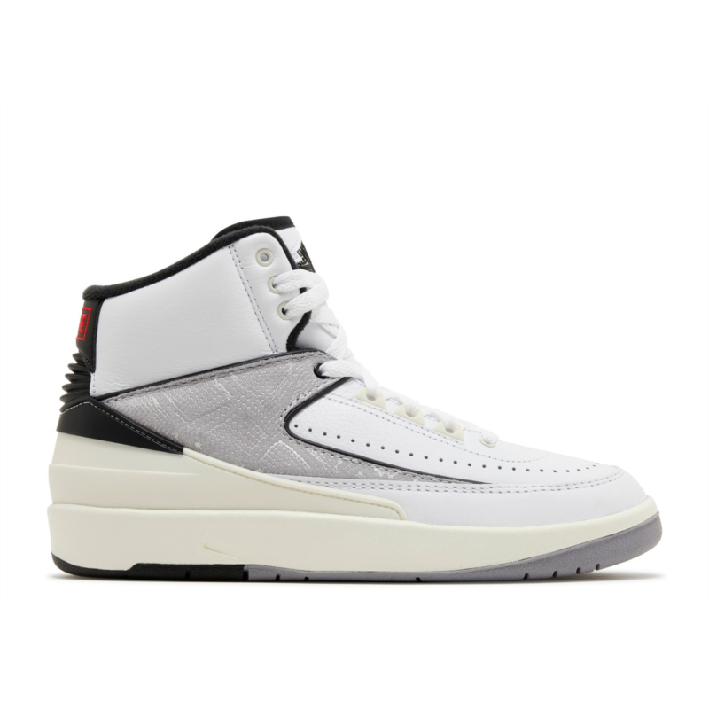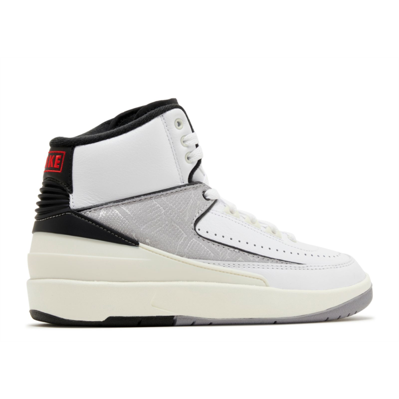 The Air Jordan 2 Retro GS ‘Python’ takes design cues from the Air Jordan 11 Low, rolling out a snakesin-patterned midfoot overlay piped in black. The Jumpman logo on the tongue and a crimson Nike wordmark on the back tab provide the white leather upper a dash of contrast. The heel counter and midsole add another subtle touch with an off-white finish. The latter has an encapsulated Air-sole heel unit for cushioning underfoot.