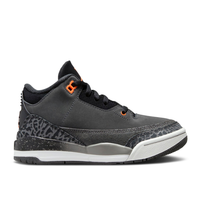 The 2023 Air Jordan 3 Retro PS ''Fear'' reintroduces a dark and subtle colorway from 2013, made for pre-schoolers, to mark the 35th anniversary of this iconic shoe. The upper part of the shoe arrives in dark grey nubuck, with matching elephant print overlays on the front and back. The shoe has a three-tone foam midsole for lightweight cushioning. The eyelets, molded back tab, and Jumpman logo appear in Total Orange.