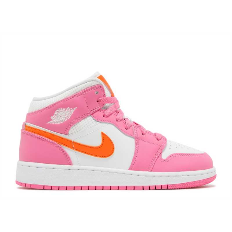 The Air Jordan 1 Mid GS ''Pinksicle Orange'' features a smooth leather upper that combines vibrant pink overlays against a white foundation. The Swoosh and a large Jumpman tongue tag appear in Safety Orange, and an airy padded collar ensures comfort. The shoe rests on a traditional cupsole with an interior Air-sole unit in the heel, white sidewalls, and a rubber outsole in pink.