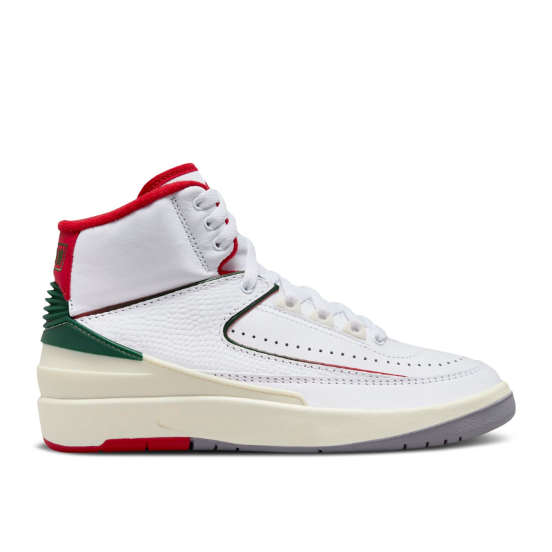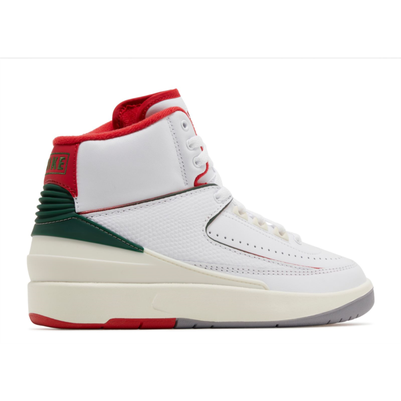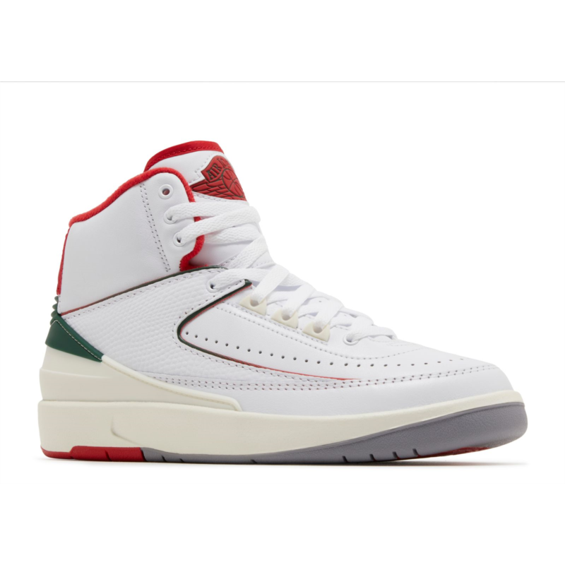 The Air Jordan 2 Retro GS ''Origins'' is made for big kids and draws inspiration from the original 1986 release, which combined premium materials with meticulous Italian craftsmanship. This shoe maintains the iconic lizard-textured overlay from the OG AJ2 against a smooth white leather upper. Surrounding the midfoot panel, vibrant red and green piping adds contrast, with these striking hues also adoring the heel and interior lining. Underfoot, the sneaker is anchored by a supportive foam midsole in off-white with interior Air-sole cushioning technology. The branding elements appear on the back tab with a Nike wordmark on the back tab and on the tongue with an embossed Wings logo, representing the iconic Jordan brand.