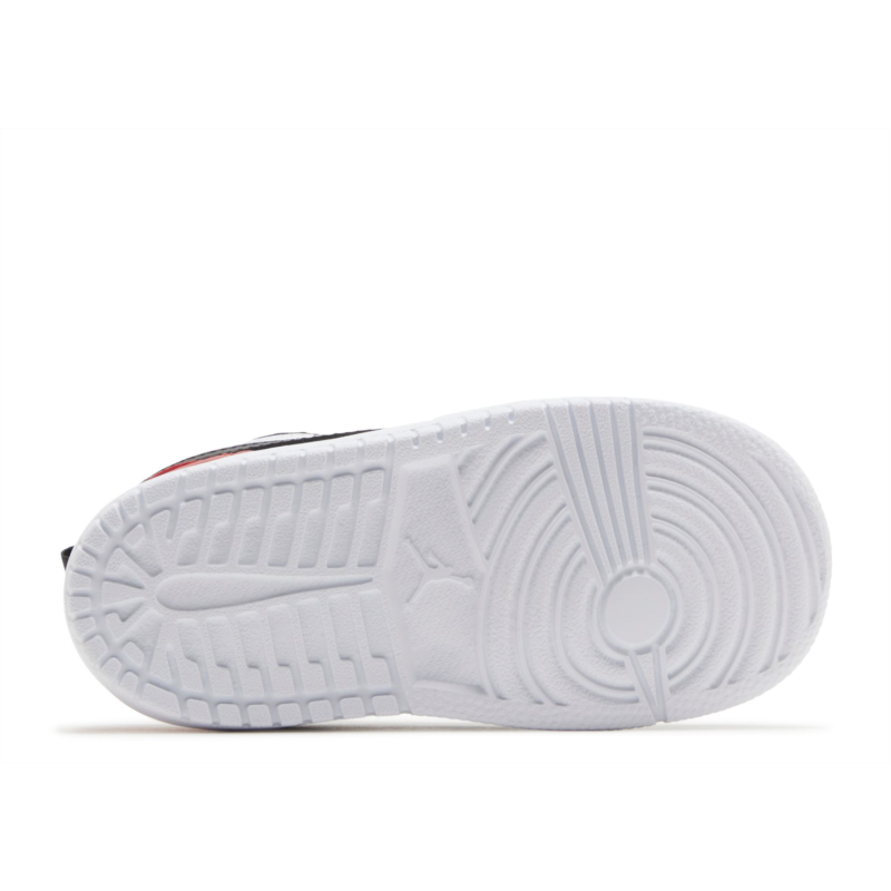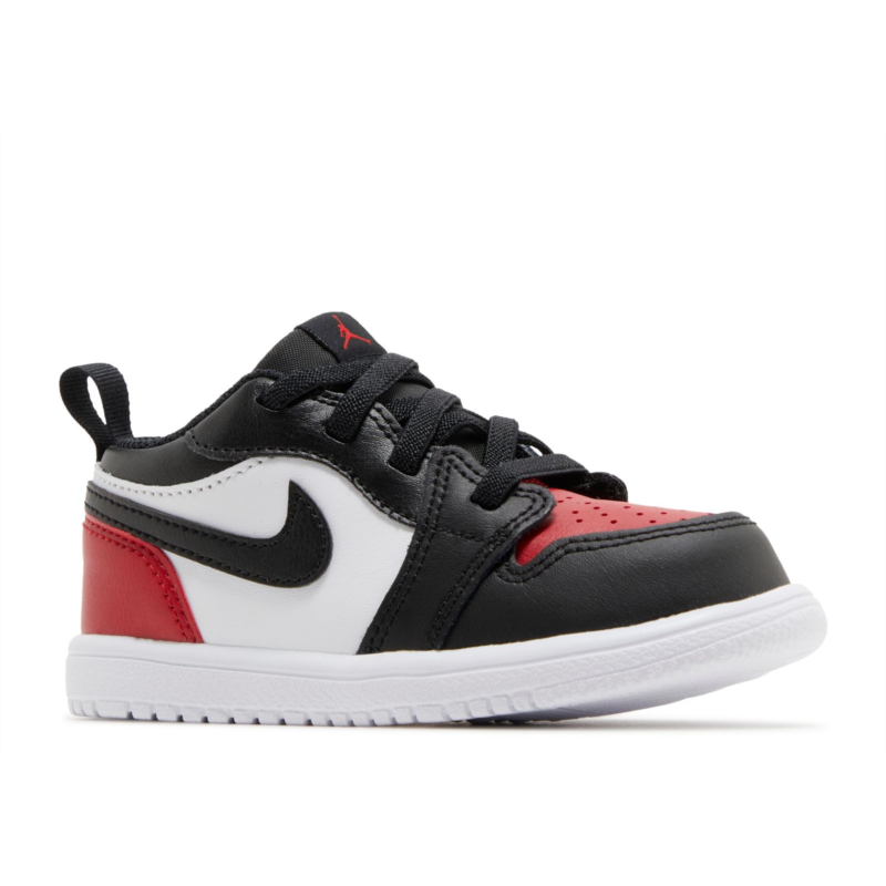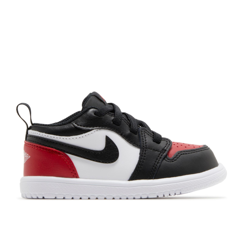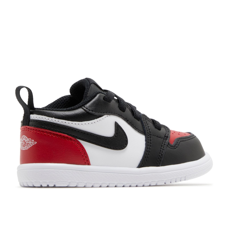 The Air Jordan 1 Low GS ''Bred Toe 2.0'' brings back the iconic Chicago Bulls colorway, rolling out a smooth white leather upper contrasted with black accents on the eyestay, collar, forefoot and the iconic Swoosh. Red pops land on the toe box and back of the heel, which gets a stitched Wings logo to keep the iconic look. A traditional cupsole pairs with white sidewalls and a red rubber outsole to wrap up this classic design.