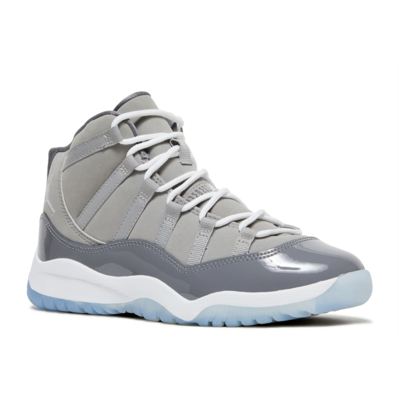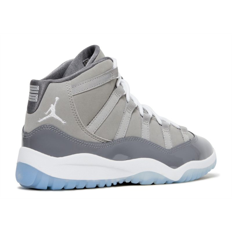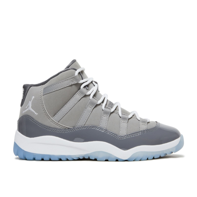 Celebrating the shoe''s 20th anniversary available in kid sizes is the 2021 reissue of the Air Jordan 11 Retro PS ''Cool Grey.'' It stays true to its'' original release with a grey nubuck upper with tonal webbing lace loops and a glossy patent leather overlay. The branding includes a Jumpman logo embroidered on the lateral ankle and ''23'' stamped on the back tab. It''s built on a white Phylon midsole and translucent rubber outsole.