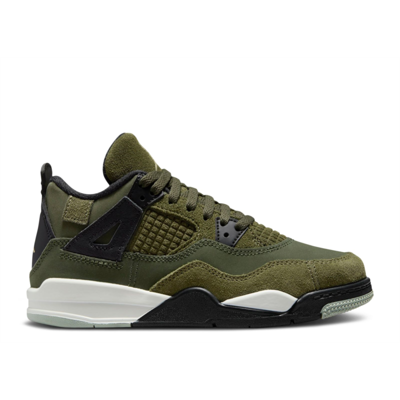 Designed for young children, the Air Jordan 4 Retro SE Craft PS in ''Olive'' arrives in layered nubuck and suede materials. The collar is lined with black textile, which matches the eyelets and leather support wings, while the side panel features an embossed suede design in a grid pattern instead of the TPU netting seen on the original shoe. The mid-top shoe sits on a white foam midsole and has a rubber outsole with a herringbone pattern. The tongue and a semi-transparent tab at the back display cream-colored Jumpman logos.