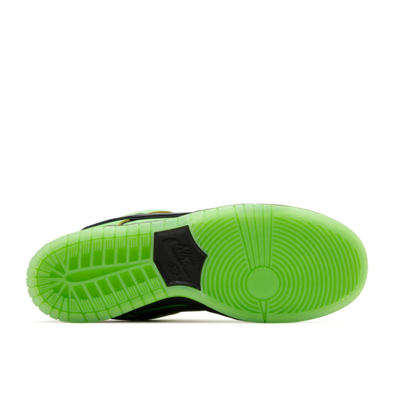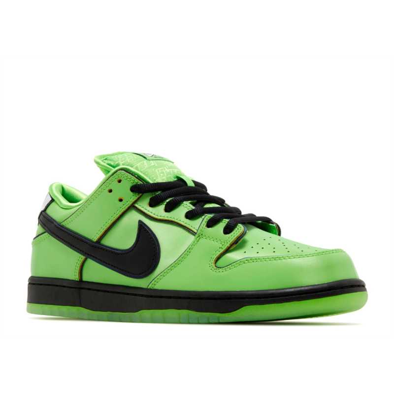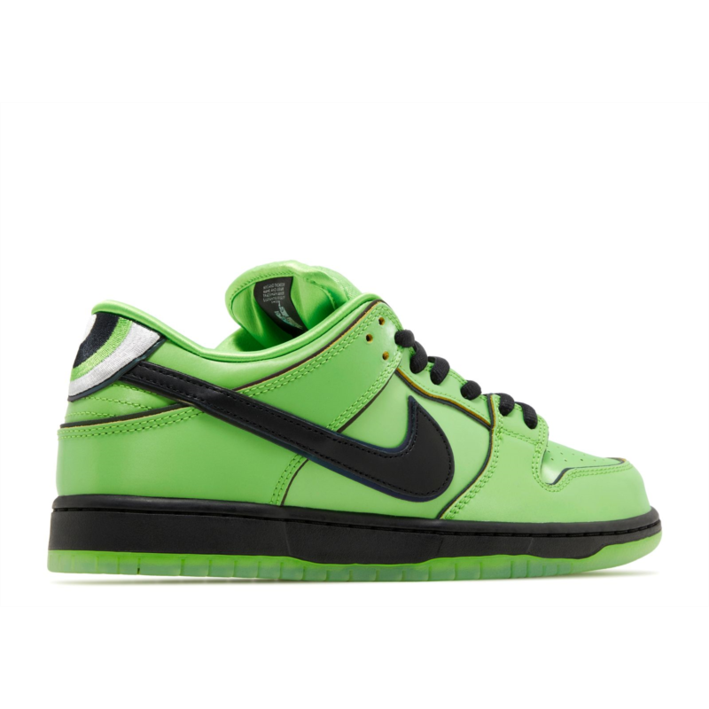 As part of a trio of sneaker releases commemorating the beloved animated show, the Powerpuff Girls and Nike introduce the Dunk Low Pro SB QS ''Buttercup.'' A vibrant green, shimmering textile upper pairs with a contrasting black Swoosh and a luxe satin lining. The shoe''s solid black midsole, is complemented by a green-tinged translucent rubber outsole. The plush stuffed tongue is adorned with a woven ''Buttercup'' Nike SB tag and Powerpuff Girls'' branding throughout, with Buttercup''s large eyes decorating the heel tabs.