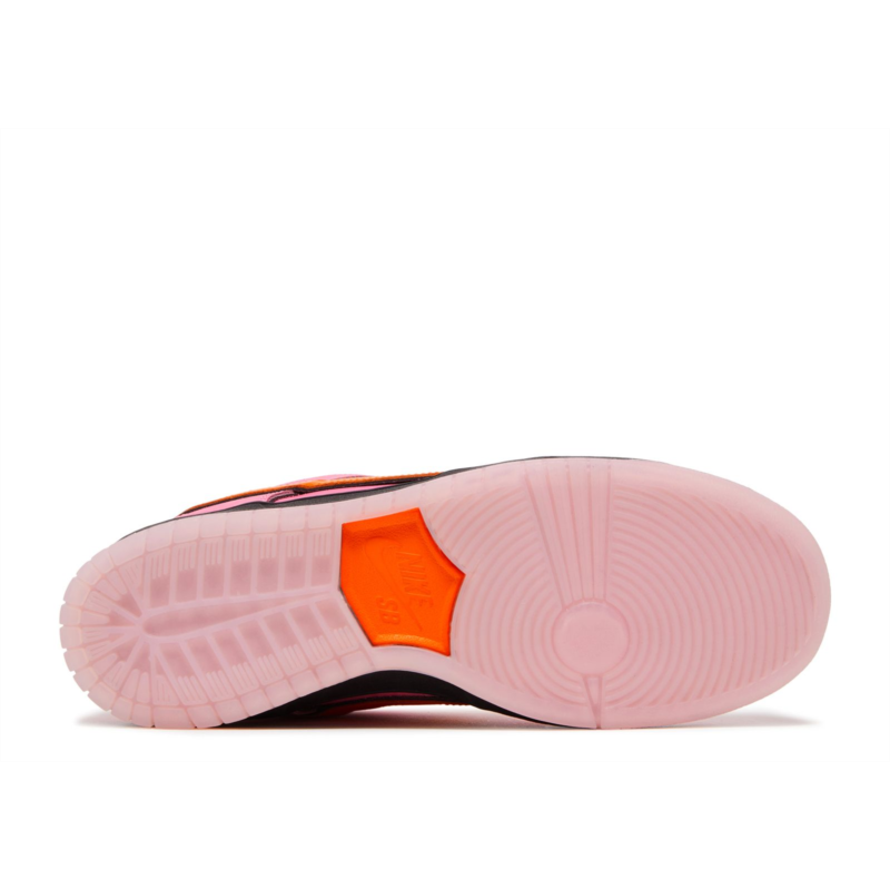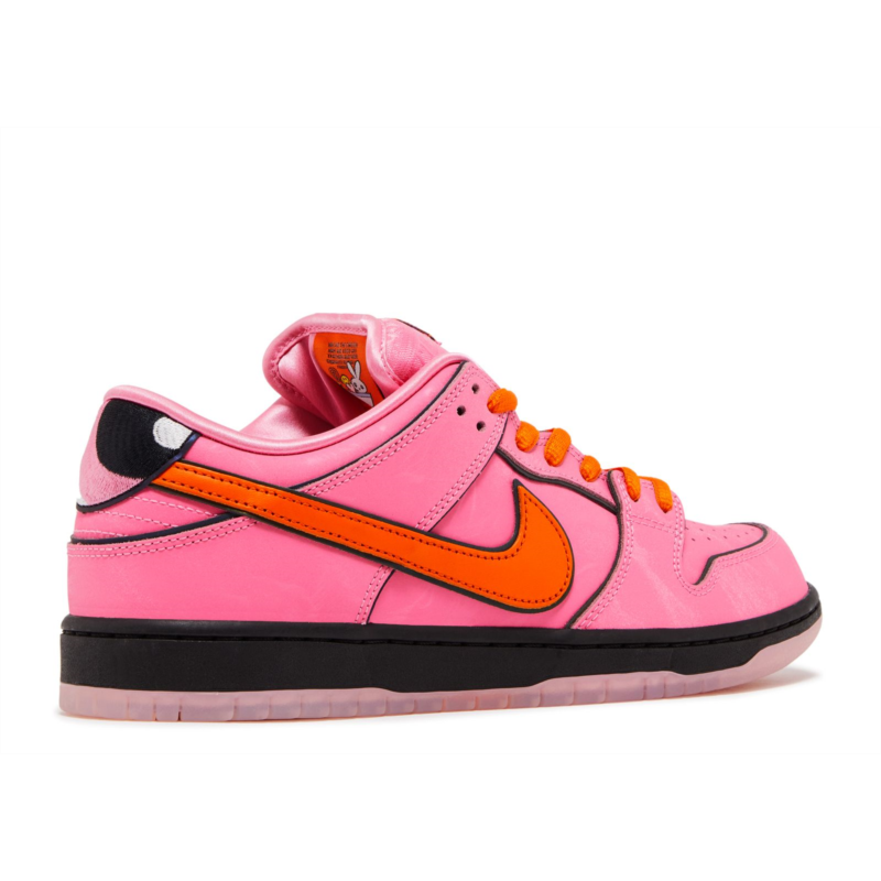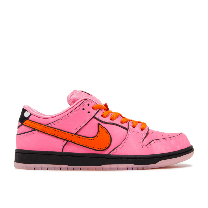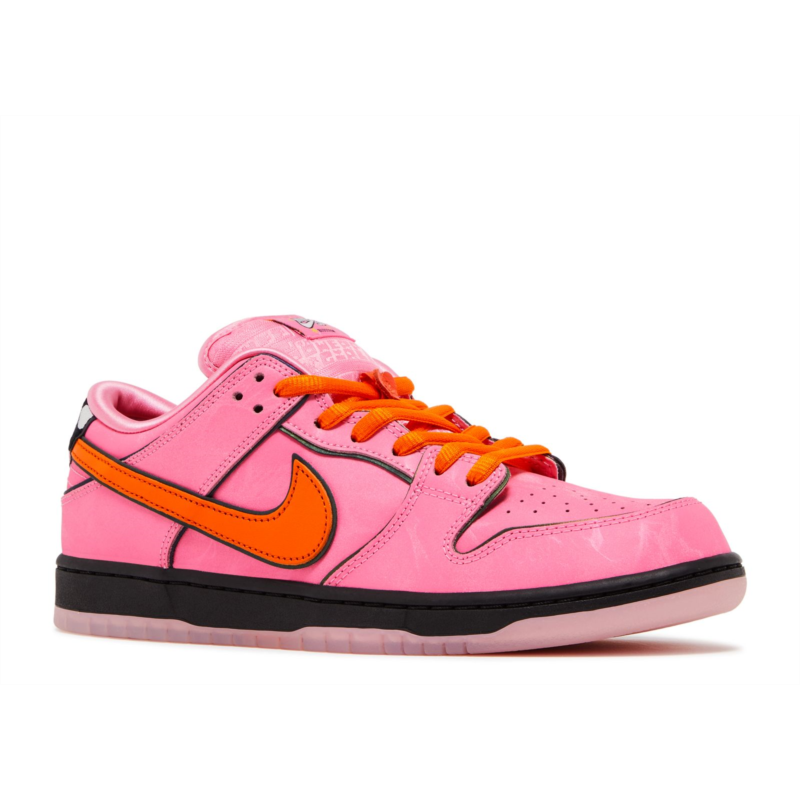 The Powerpuff Girls and Nike partner to release the Dunk Low Pro SB QS ''Blossom,'' one pair in a collection inspired by the popular animated series. With a pink nubuck upper paired with an orange Swoosh and eye-catching reflective black piping, the shoe’s padded collar and plush tongue feature satin lining, a woven Nike SB tag and repeating Powerpuff Girls logo pattern. The sneaker is grounded by a black midsole, with a touch of pink in the clear rubber outsole. Blossom''s large eyes are stitched on each heel tab, and the custom sockliners feature Nike Zoom heel cushioning.