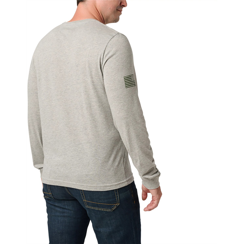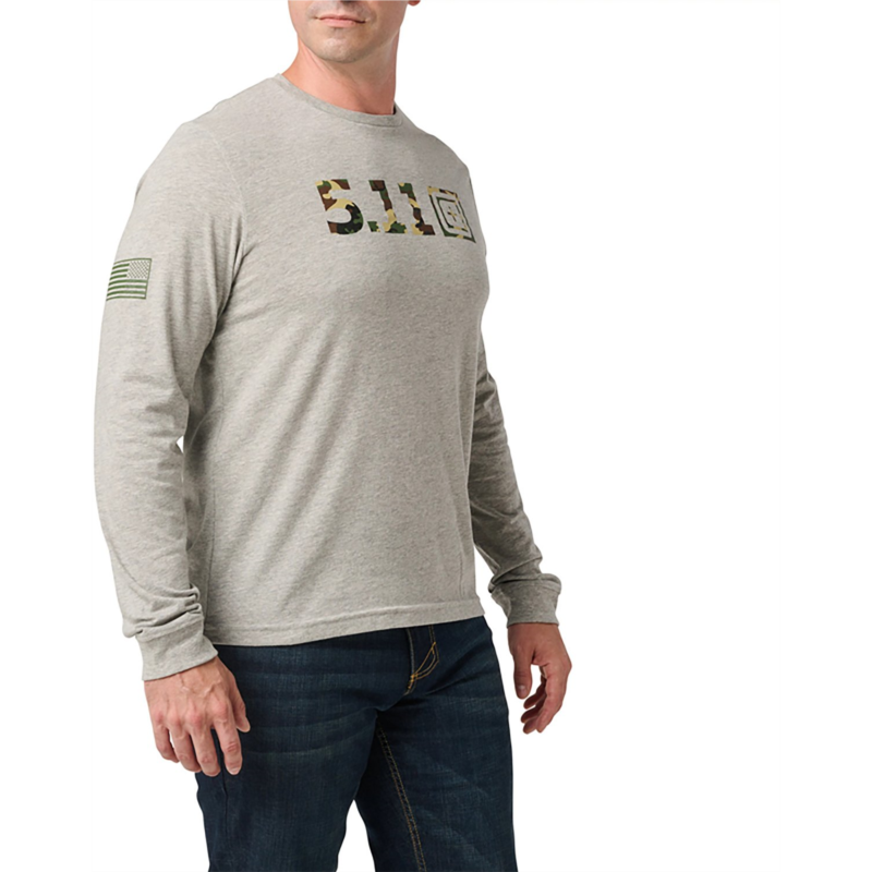 Feel confident in the 5.11 Tactical Men''s Woodland Camo Fill Long Sleeve Shirt. The 60% cotton and 40% polyester jersey construction offers a soft feel all day, and the double-needle stitching on hems and sleeves provide additional strength. The front chest logo displays your brand pride, and the premium ink lasts through the long days. 60% cotton and 40% polyester jersey material provides comfort and durability