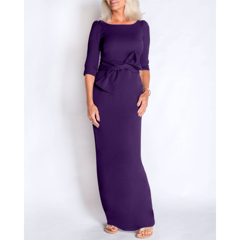 A maxi dress that is just as cute as it is comfortable.Introducing the Jackie Gown II by Camilyn Beth, a classic choice for the modern woman seeking elegance. This sheath silhouette dress features three-quarter sleeves and is crafted from luxurious stretch crepe for a flattering fit and comfortable wear. It comes with an invisible zipper closure and a removable sash for a touch of romantic flair. Designed with a thoughtful fit in mind, it''s fully lined and bra-friendly, and should be dry cleaned only. Available in a rich eggplant color, it’s perfect for any special occasion and the ideal pick for mothers of the bride or groom.