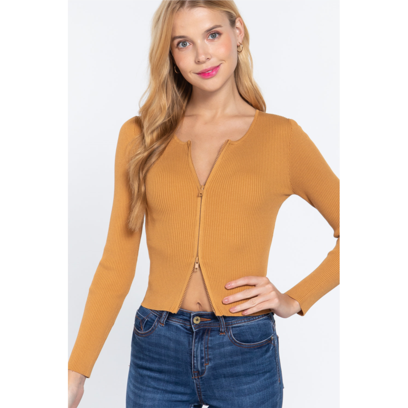 [US] TRUEDAMES rib sweater top w/front zipper