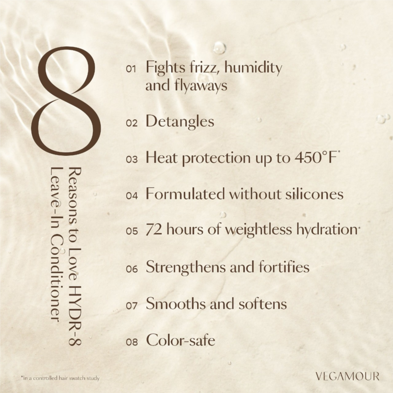 What Else You Need to Know: The HYDR-8 Leave-In Conditioner provides eight key benefits: it fights frizz, humidity, and flyaways; effortlessly detangles; provides heat protection up to 450ºF; strengthens and fortifies, all while delivering hydration. It is also color safe and formulated without silicones.