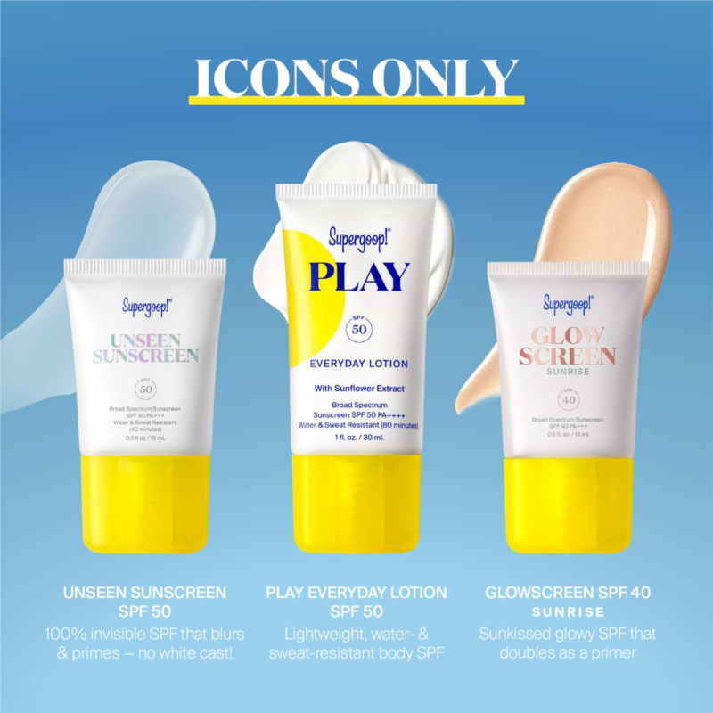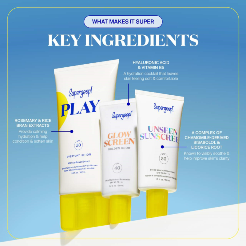 What Else You Need to Know: Unseen Sunscreen SPF 50 is the iconic 100 percent invisible, weightless, scentless sunscreen that disappears into skin, doubles as a primer, and is clinically tested to improve skin clarity.* Glowscreen SPF 40 is a glowy tinted sunscreen that is clinically tested to deliver all-day hydration** and primes for makeup with a radiant, sunkissed finish. PLAY Everyday Lotion SPF 50 is a fast-absorbing face and body sunscreen that’s water- and sweat-resistant for up to 80 minutes.