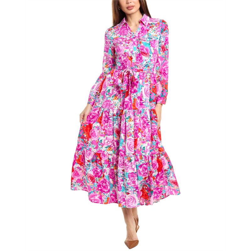Introducing the Gracia Tiered Midi Dress, a stunning addition to your wardrobe. This vibrant floral pink dress features dual chest pockets, button cuffs, shirred detailing, and a tie sash for a stylish look. Measuring approximately 53 inches from shoulder to hem, this dress is perfect for any occasion. With a button placket and left side seam zipper, getting dressed is easy. Made from 100% polyester, this dress is easy to care for with a hand wash. Imported and designed by the inventive and modern brand Gracia, this dress is sure to turn heads wherever you go.