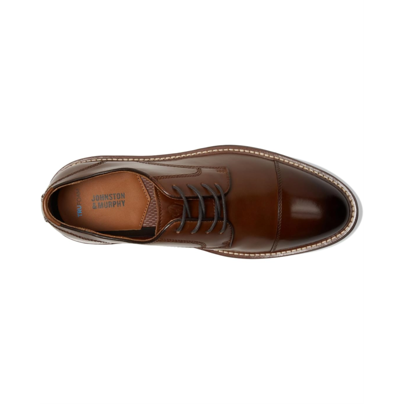 - Designed with an ultra-light Trufoam midsole for cushioning and comfort, the Johnston & Murphy Upton Cap Toe shoes are an ideal choice for formal occasions and events. The full-grain leather upper features a lace-up closure for a secure fit. They are made of a removable, molded footbed with memory foam and leather and 50% recycled polymesh lining.