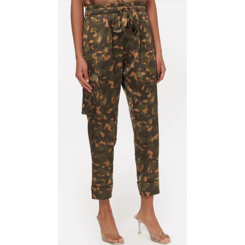 No gym necessary for these cool-girl joggers. This stretch silk sandwash charmeuse pant features an elasticated waistband with a functional self-tie, and ruffle detailing at the top edge- combining?comfort with an elevated style. It''s a cropped length pant with a rolled cuff and?is finished with side?cargo?pockets with a flap closure. 92% Silk, 8% Spandex. Dry Clean & Steam Only. Imported. Relaxed fit.