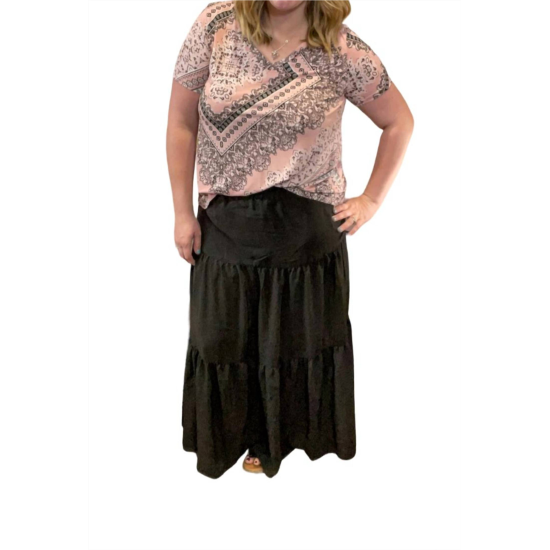 Tuck in your favorite tee for a more casual yet feminine look.Crafted from a luxurious blend of 70% Rayon and 30% Polyester. Solid black hue. Features a convenient pull-on, tiered silhouette. Embrace the maxi length crafted from high-quality rayon.