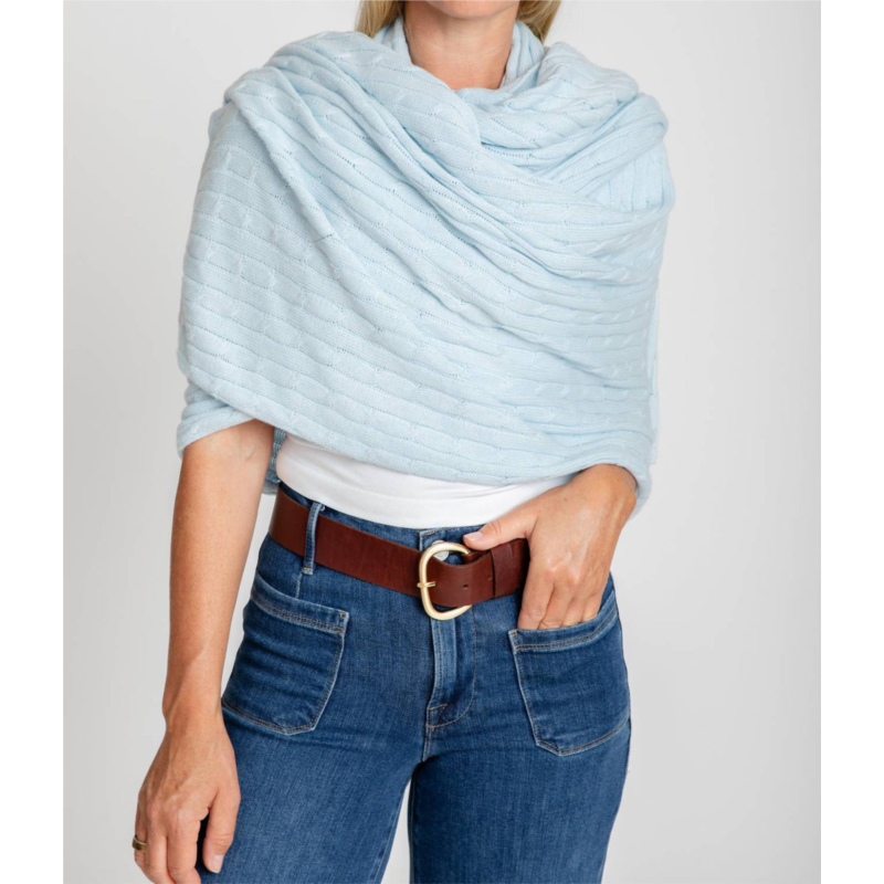 Add this to any outfit for a perfeclty polished look.Introducing the Cable Wrap by Burgess Sweaters, a cozy and versatile piece available in frost blue. Made from a luxurious blend of 95% cotton and 5% cashmere, this wrap is perfect for layering or as a beach gathering accessory. With generous dimensions of 81 inches by 36 inches, it offers ample coverage. Enjoy the convenience of machine washing to maintain its softness and comfort.