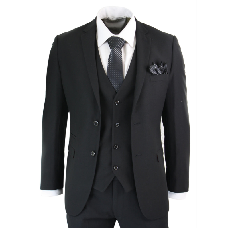 We are proud to introduce you to our own range of suits & accessories, after working with numerous suppliers for over a decade we knew it was time to officially launch our own product range to fill the gaps between whats already in the Market. We have deployed our range of suits based on traditional styles with a Modern twist, selecting only the finest fabrics and working directly with manufacturers cutting out the middle men to bring you a top quality product at unbelievable prices!Mens 3 Piece Black Tailored Fit Complete Suit Classic Door Man Mourning Funeral