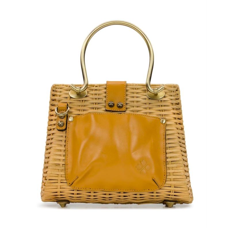 - Breezy elegance, timeless charm - meet the Patricia Nash Rodia Top Handle Bag, a stunning fusion of natural rattan and luxurious full-grain leather trim. Designed for effortless sophistication, this beauty features signature brushed brass hardware, handcrafted stitching, and a chic twist-lock closure for vintage appeal. The spacious interior, lined in soft faux suede, offers a zippered pocket and two slip pockets for easy organization, while the exterior slip pocket adds quick-access convenience. A detachable crossbody strap and protective metal feet ensure both versatility and durability. Finished with a delicate Spring Multi print scarf, the Rodia is your perfect companion-whether it''s a sunlit picnic, a seaside escape, or the boardroom.