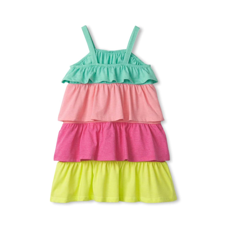 - Twirl-worthy fun in every layer! Hatley Kids Neon Rainbow Tiered Layered Dress is a vibrant burst of color that makes every movement magical. Featuring a square neck and sleeveless design, this A-line beauty is built for comfort and style. The elastic-encased neckline ensures a perfect fit, while tri-fold self straps with mobilon tape provide durability and prevent stretching. Three tiers of ruffles - each finished with neat turnback hems - add playful volume that''s set into the lining for a smooth, flattering silhouette.