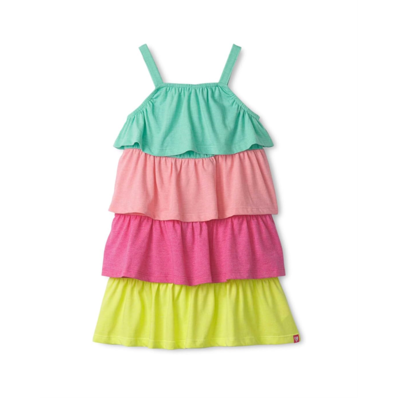 - Twirl-worthy fun in every layer! Hatley Kids Neon Rainbow Tiered Layered Dress is a vibrant burst of color that makes every movement magical. Featuring a square neck and sleeveless design, this A-line beauty is built for comfort and style. The elastic-encased neckline ensures a perfect fit, while tri-fold self straps with mobilon tape provide durability and prevent stretching. Three tiers of ruffles - each finished with neat turnback hems - add playful volume that''s set into the lining for a smooth, flattering silhouette.