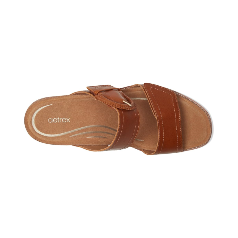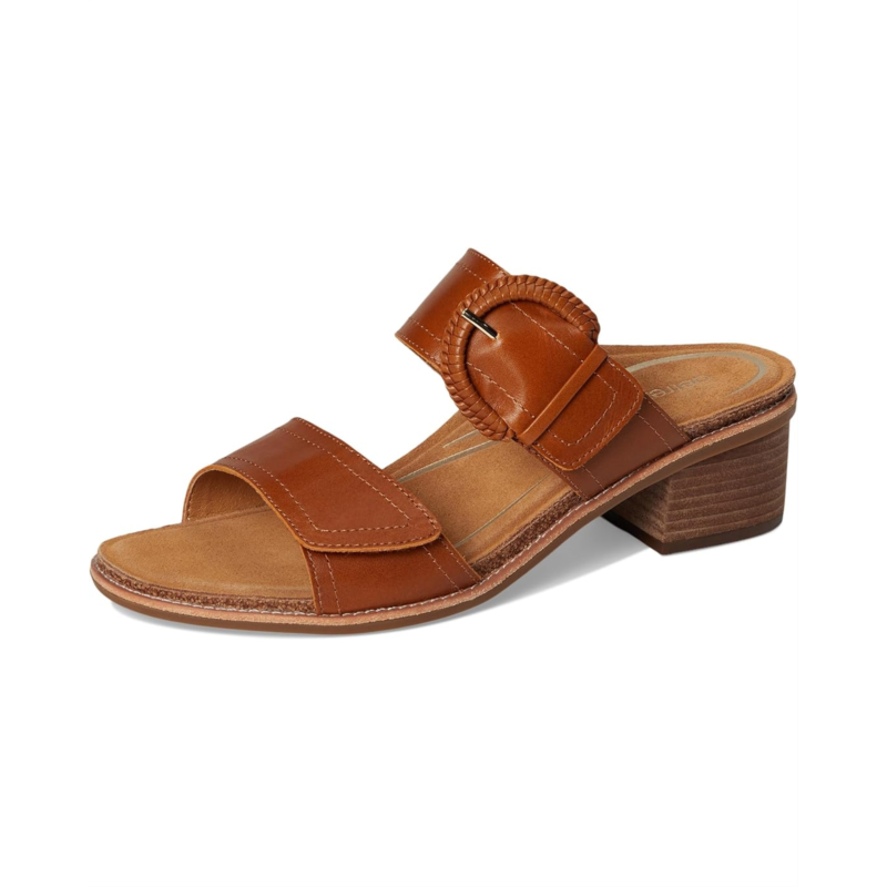 - Elevate your style and add superior comfort wearing Aetrex Tatiana Sandals. Designed with fully adjustable hook & loop closures, these heels ensure a personalized and secure fit. The open round-toe sandals come with a leather upper, faux suede lining, and a foam insole. The block heel adds a touch of sophistication while maintaining stability. The Aetrex Orthotic System is Built-In to every pair features arch support that helps to stabilize your body, align your feet and relieve common foot pain. With its timeless design, these heels are versatile enough to complement any outfit.