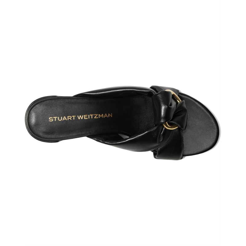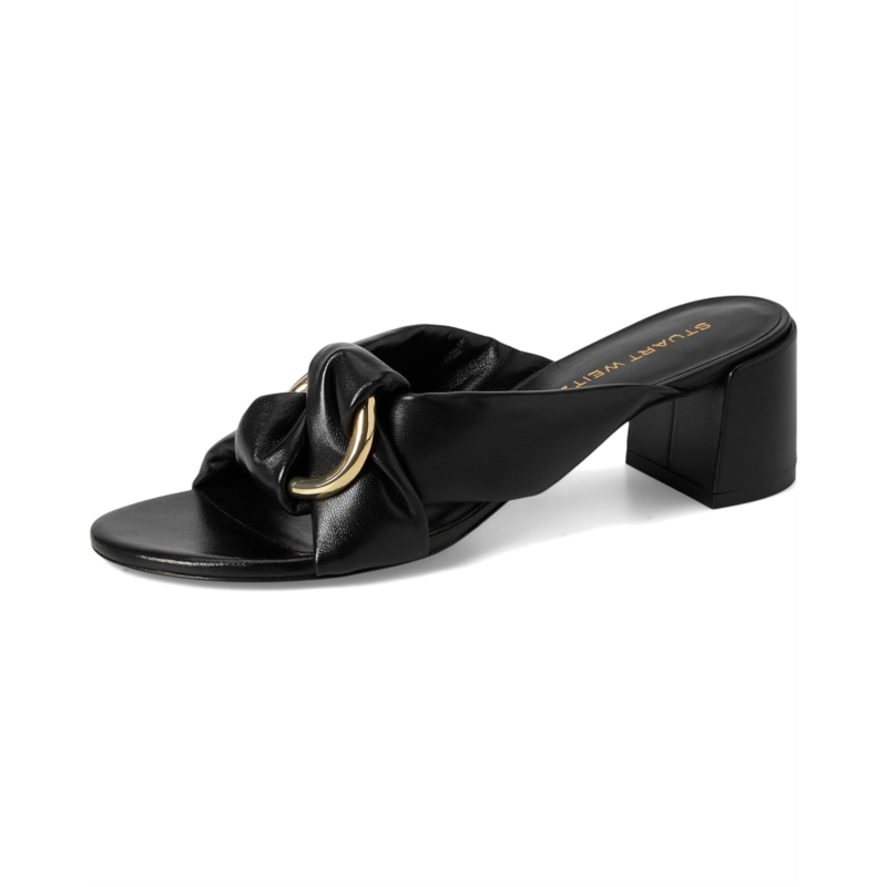 - Prepare to turn heads donning the Stuart Weitzman Cece Block Slides 50. The knotted leather upper and goldtone ring detail add a touch of sophistication to your look. Crafted from beautiful mestizo leather and lined with plush lamb leather, these slides offer both style and comfort. Complete with leather insole and block heels for added support, these slides are perfect for any occasion with their chic open toe design.