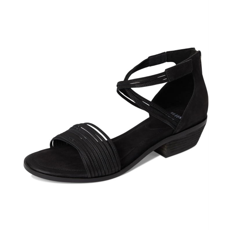 - Feel the endless comfort wearing the Eileen Fisher Viro Sandal. Crafted from leather upper, lining, and insole, this pair of sandals features open round toe, low block heel, multiple bands at the front of the shoe and at the ankle, and back zippered closure for ease. It comes with brand detailing on the footbed.