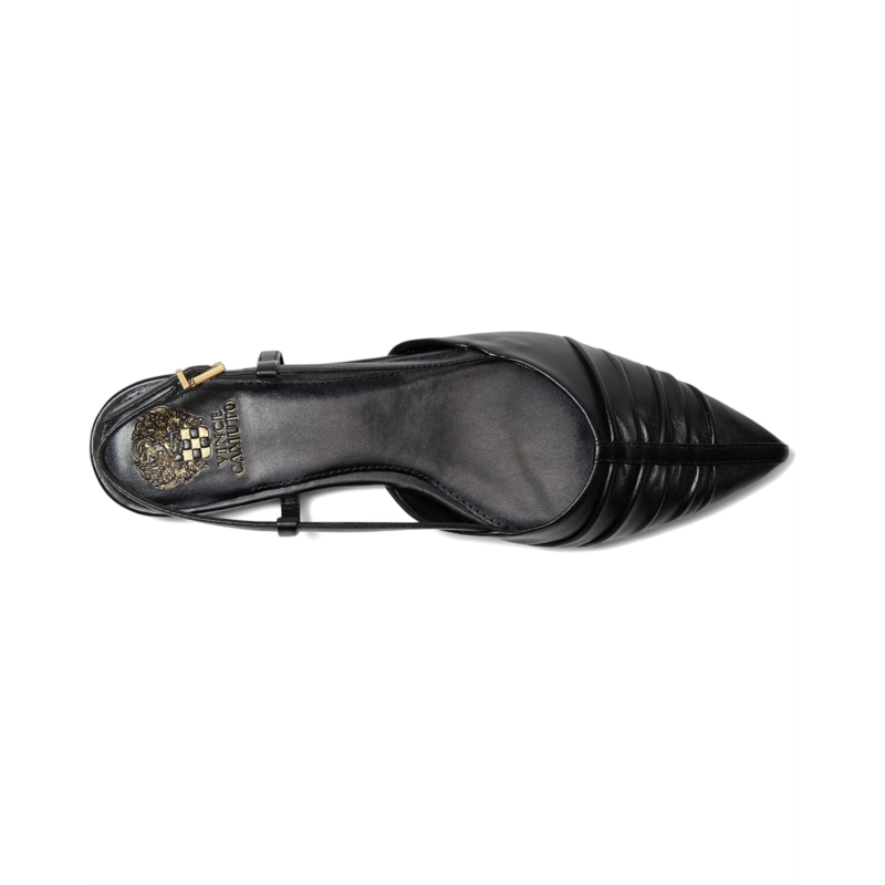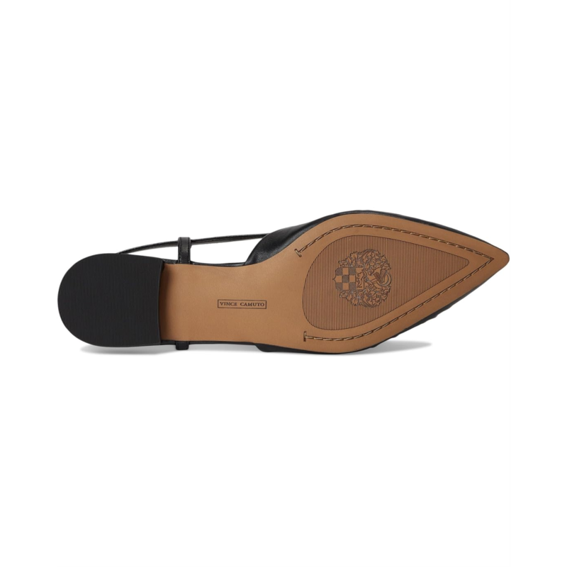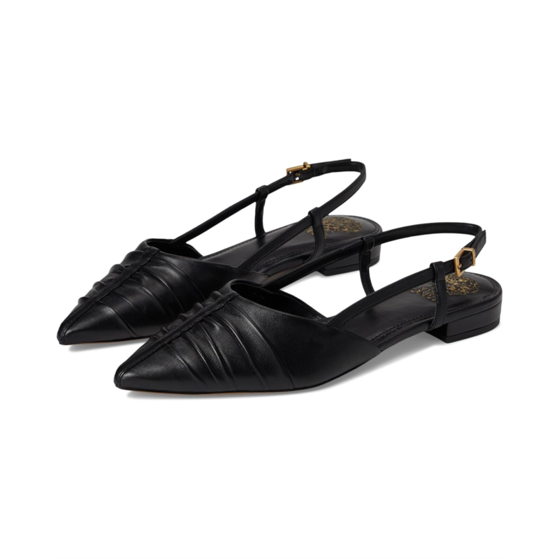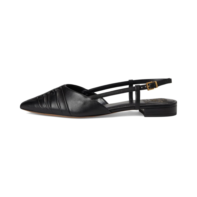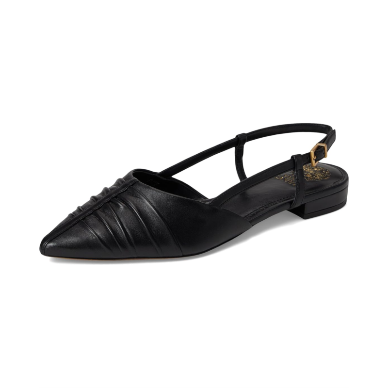 Step into effortless sophistication wearing the Vince Camuto Agnes Bunched Toe Slingback Flat Mule. Crafted from buttery leather and soft suedes, these pointed-toe flats bring a touch of refinement to any look. The delicate pleated detail along the vamp adds texture and charm, while the adjustable slingback strap ensures a secure, customized fit. Designed for all-day wear, the padded footbed delivers cloud-like comfort, and the faux leather insole enhances the luxe feel. Finished with a sleek synthetic rubber outsole, these flats offer the perfect blend of style and practicality, effortlessly taking you from desk to dinner.