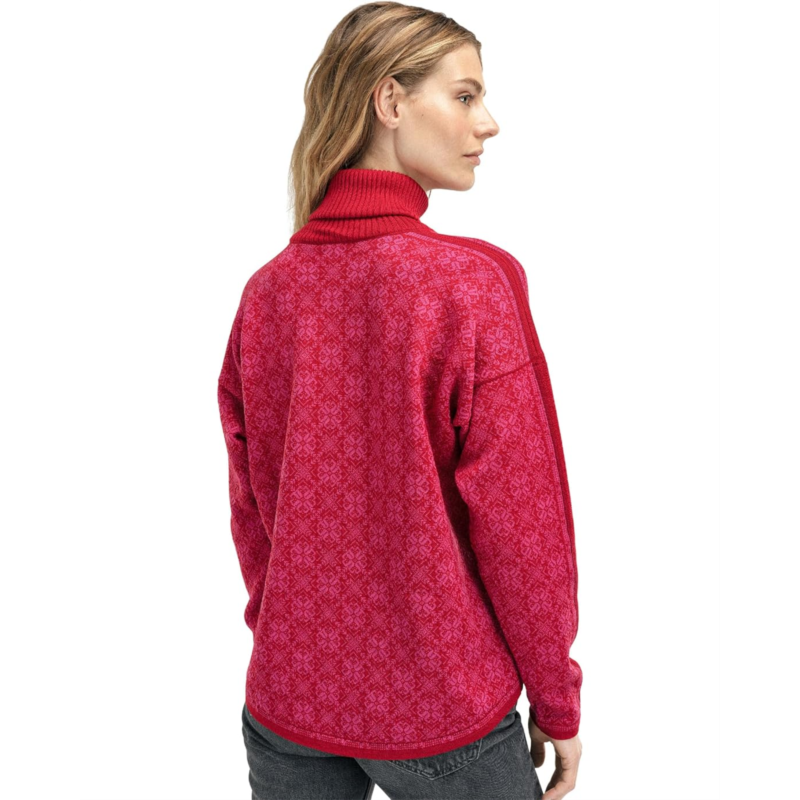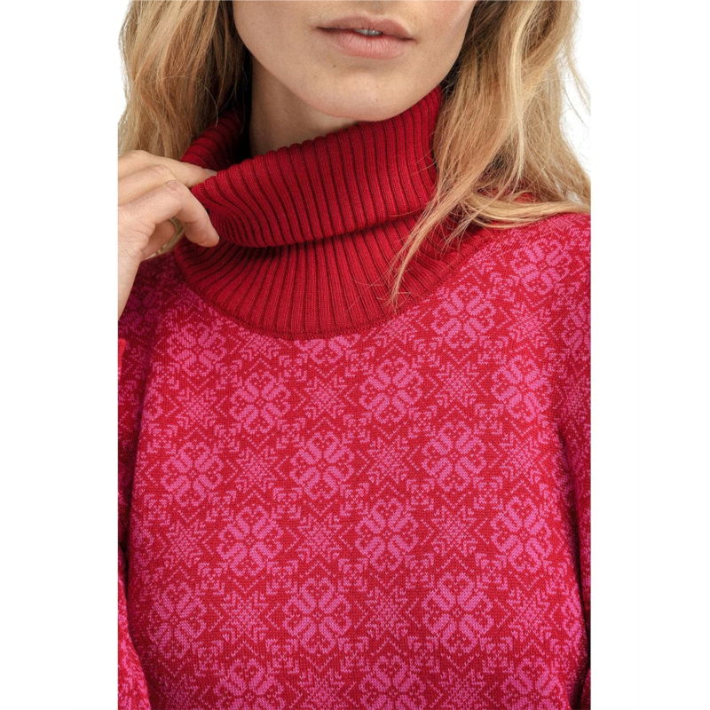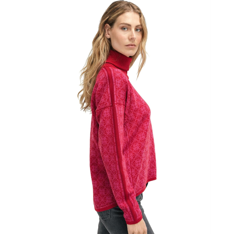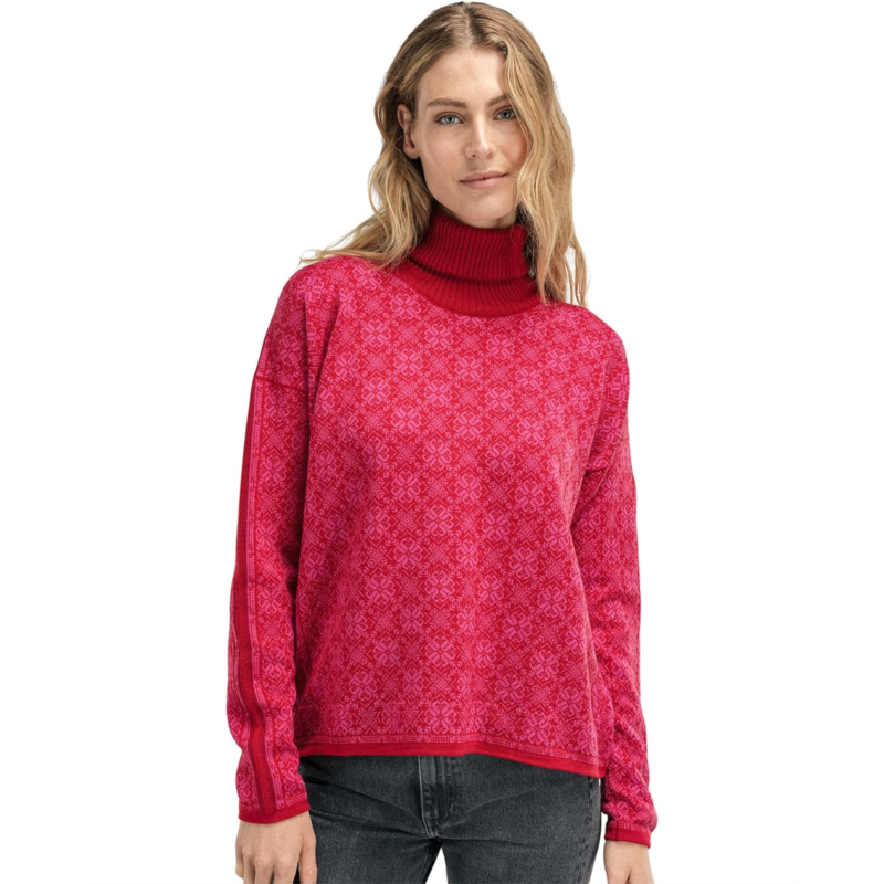 - Experience the softness and warmth of the Dale of Norway Firda Sweater, crafted from skin soft merino wool & premium knit quality. This warm & breathable wide-fit sweater for women is ideal for any occasion. The women''s pullover comes with a turtleneck collar, long sleeves, and a wide, contemporary fit. This is a remake of our sporty Frida jacket, now with a shorter front & slightly longer back. The softened, round-edged version of the eight-petal rose is repeated across the sweater.