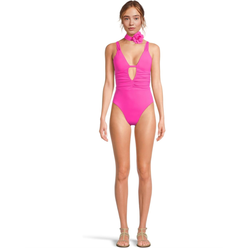 - The BECCA by Rebecca Virtue Garden Of Eden Magnolia Plunge One Piece is designed to make you stand out at the beach or poolside. It features a removable three-dimensional flower that can be easily detached for a more streamlined look. The removable belt not only cinches your waist for a flattering silhouette but can also be worn as a stylish scarf, giving you multiple styling options. For added support and comfort, the elastic underbust comes with removable cups, ensuring you have the flexibility to customize your fit.